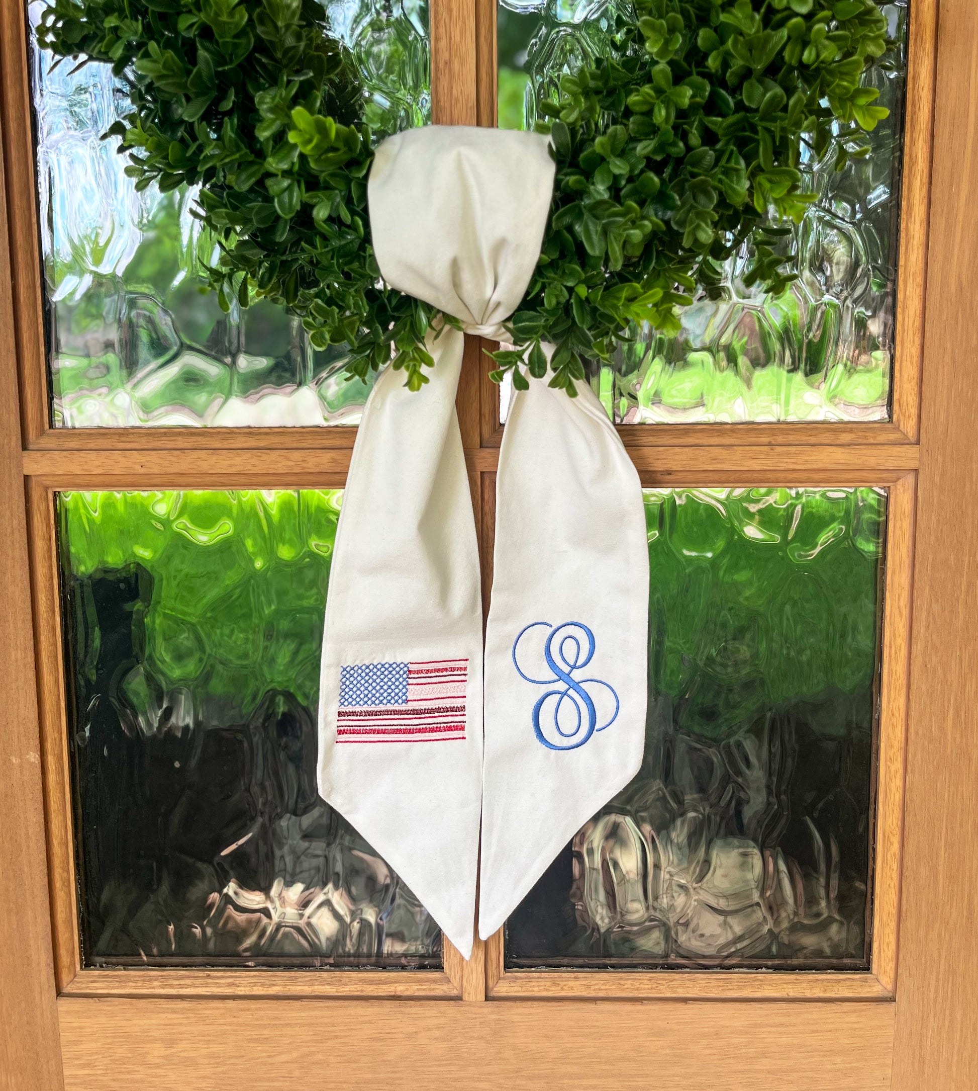 Our personalized white Wreath Wrap is designed to elevate your entry with elegance, intention, and a touch of story. Embroidered with a single letter of your choice and crafted to drape beautifully, it turns a simple wreath into a meaningful welcome. For something even more personal, you can add custom artwork that reflects your style, your family, or the season.